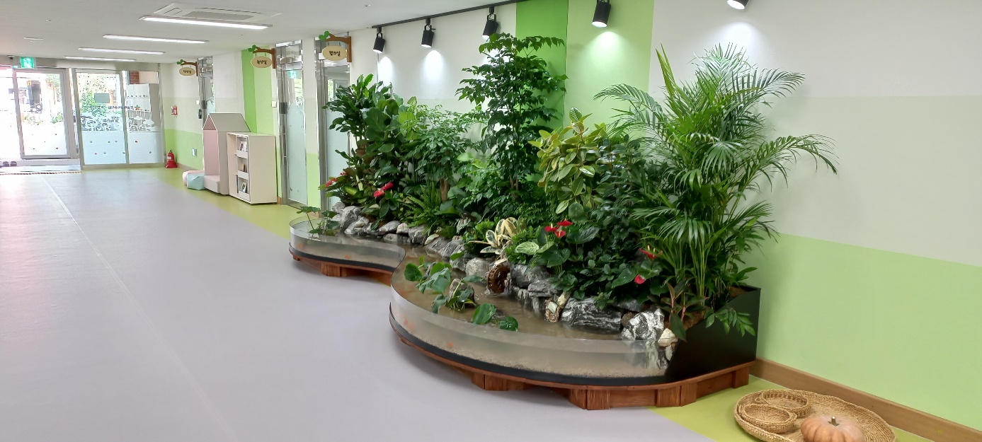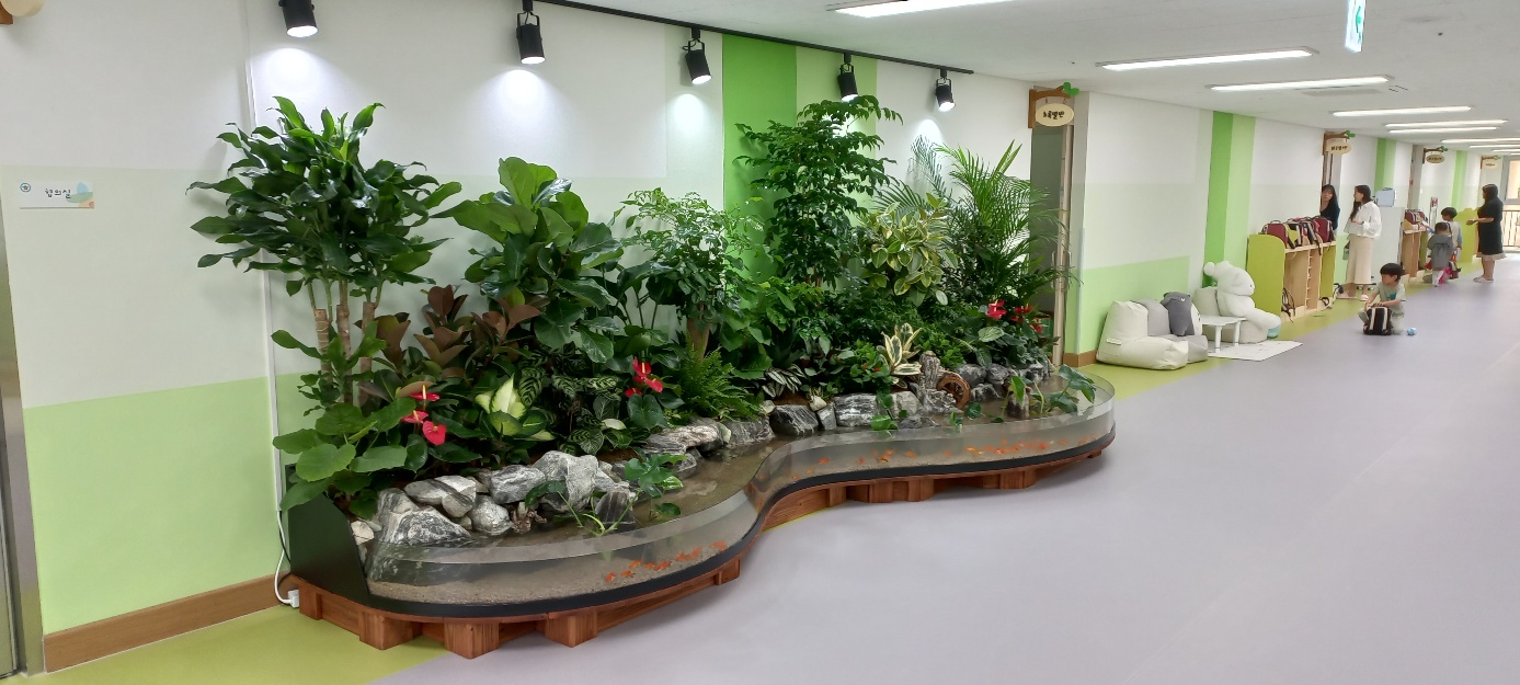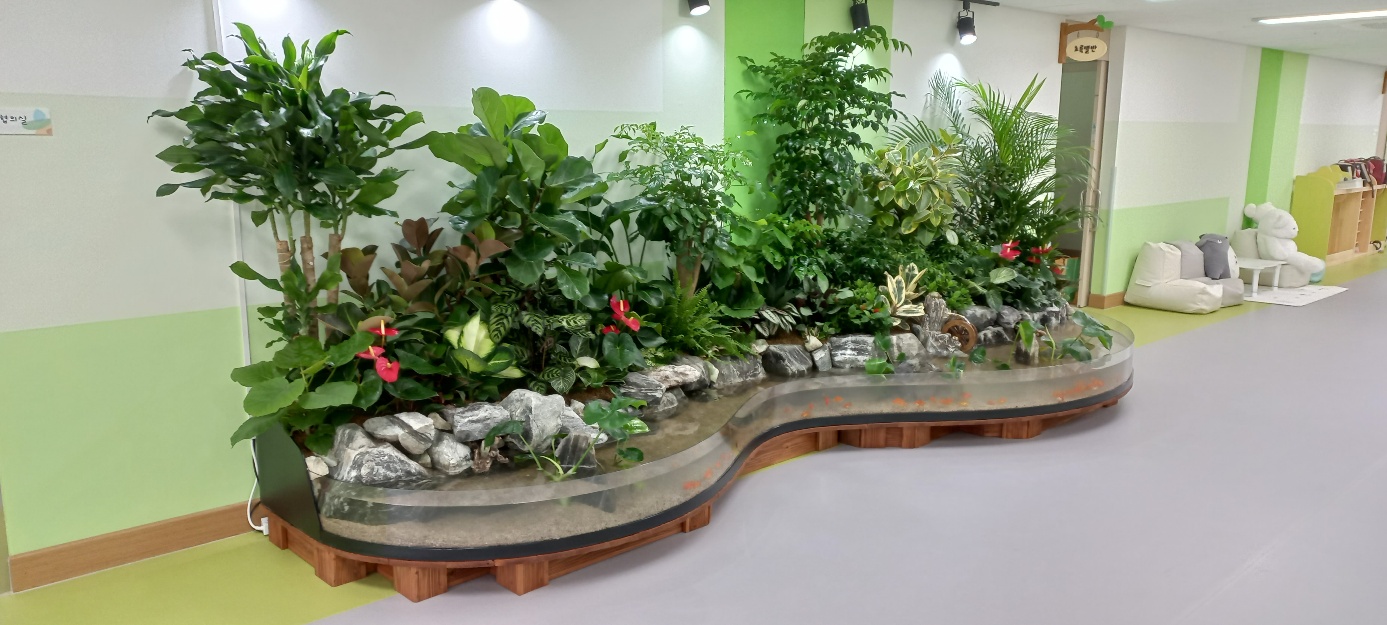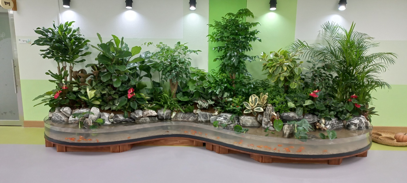 신축건물인 유치원실내에 조경시설및 가습효과를 살릴수 있는 생태조경수족관을 설치한 사례입니다. 수족관 물은 자동친화적으로 정화되는 시스템이기에 점점맑아지는 과정입니다. 설치후 얼마안된속에서 찍은 사진이기에 물의맑기가 완정하지가 안네요.^^