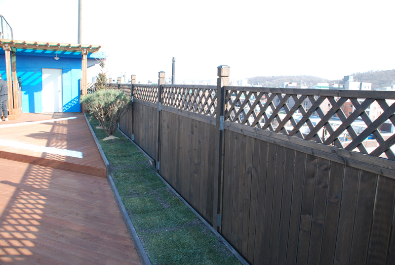 대아 티아이 옥상정원 공사/웬지칼라 목재펜스~고객님의 요청에 의해 높이1,500mm로 기존공사 보다는 약간은 높게 공사 마무리 되었습니다.