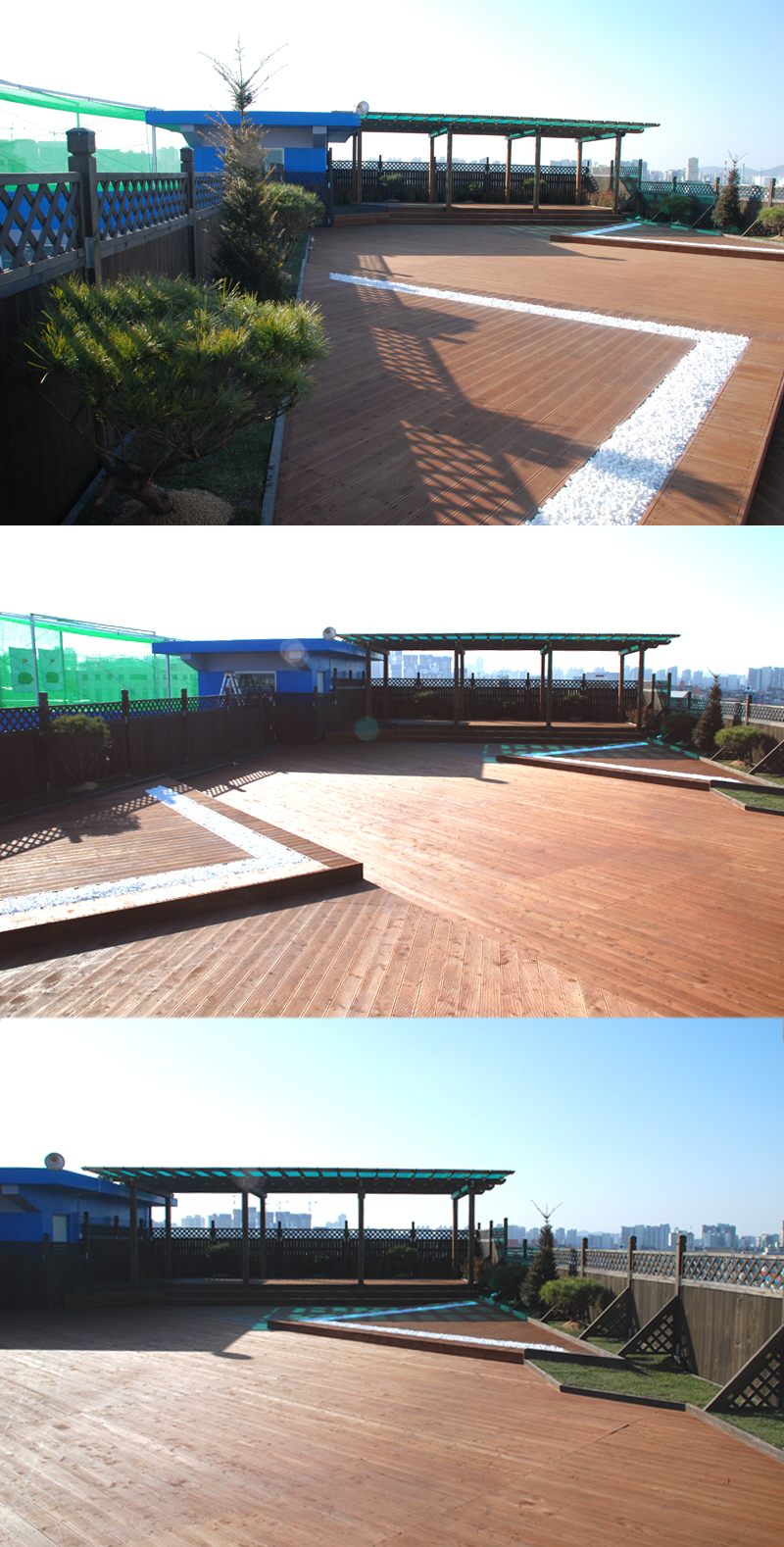 대아 티아이 옥상정원 공사/ 데크(오크칼라+백자갈포설),파고라2조,삼면 목재펜스(웬지칼라,1m50),식재공사 마무리.