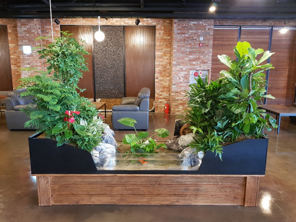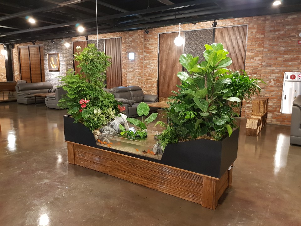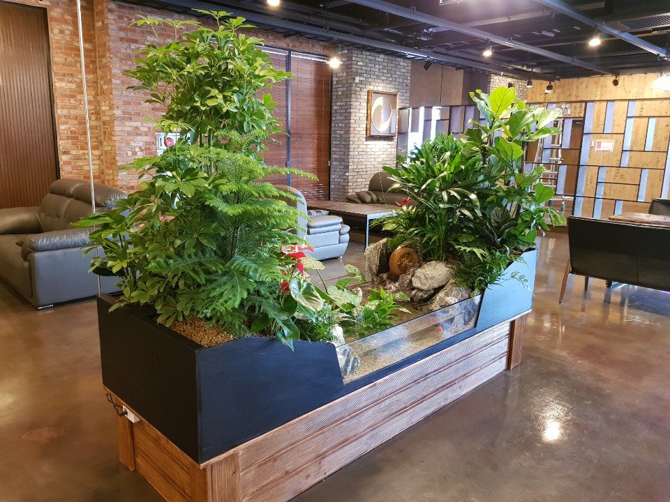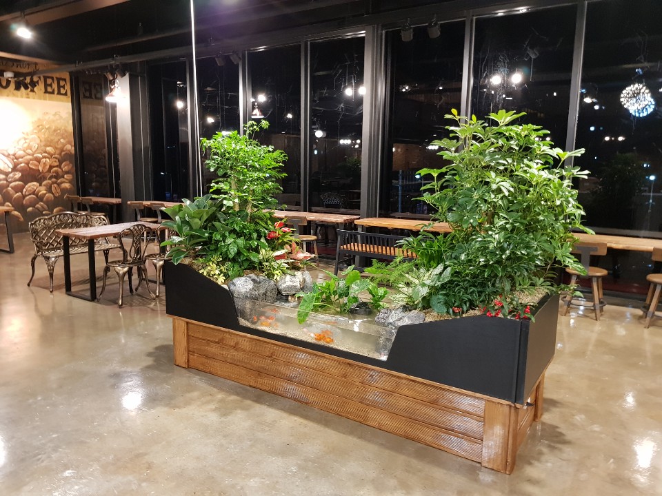 커피숍 안에 설치한 양면형 생태조경입니다.넓은 공간을 이원화 하는 용도로 설치한제품입니다. 흐르는 물소리가 음악과 함께 정겨울것 같네요.^^