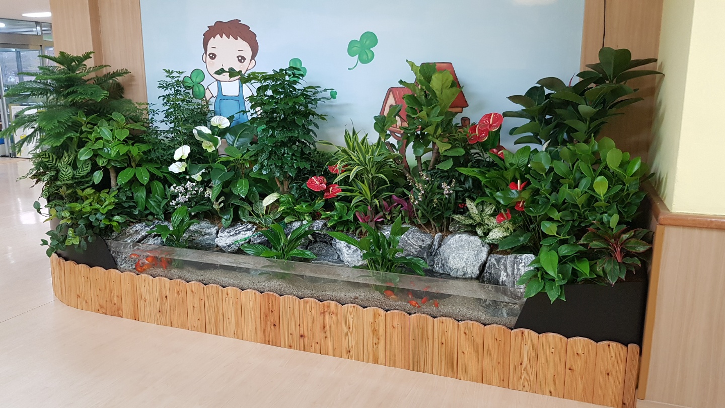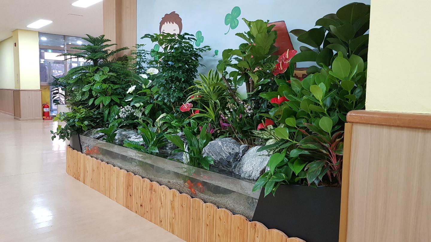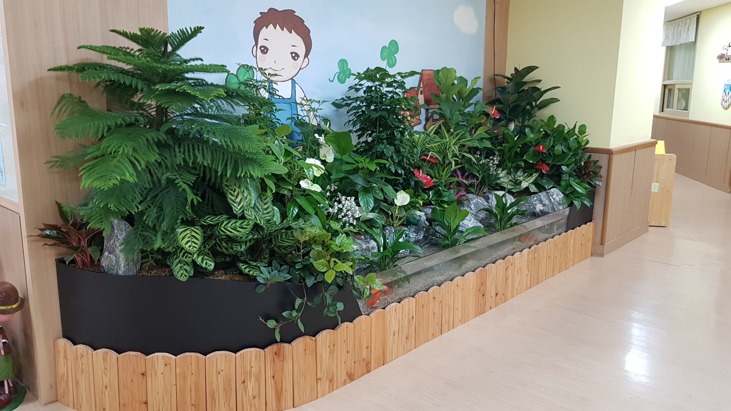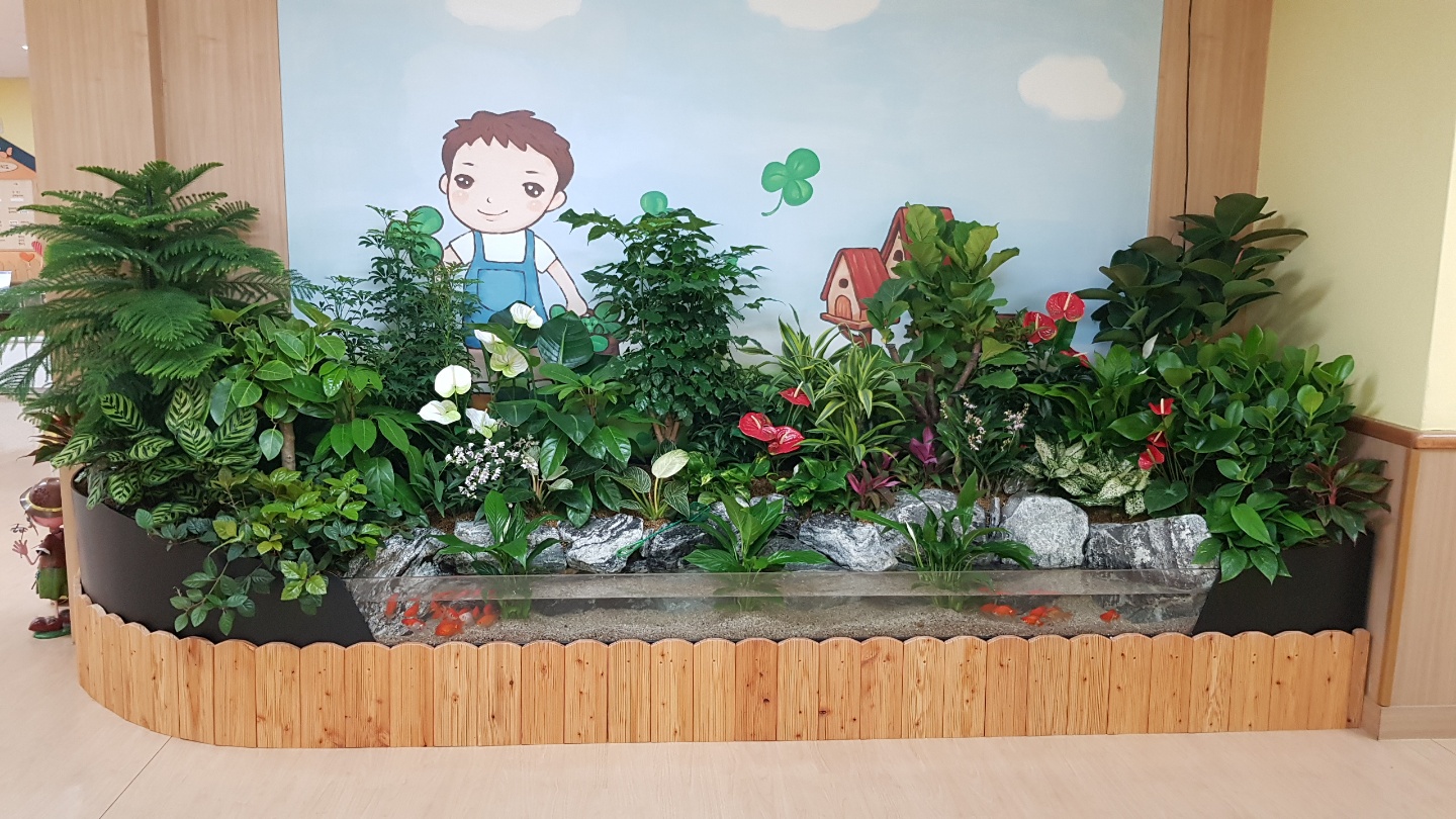수원 큰나래 유치원 1층,3층 실내생태조경 사진입니다. 자연정화 기능으로 물갈이와 식물물주기가 필요없는 편리한 제품입니다.