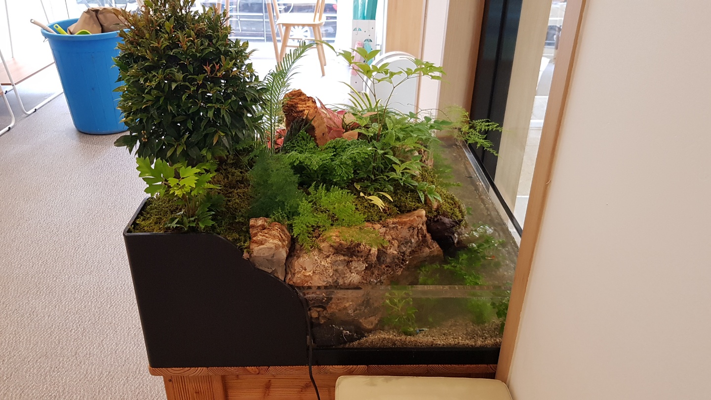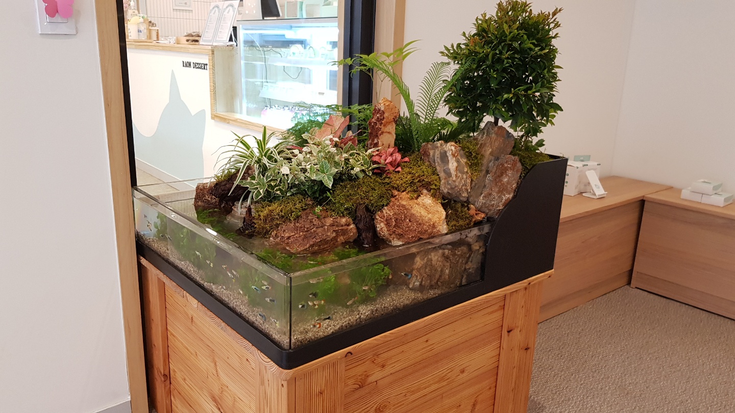 까페안 비효율공간에 생태수족관 작업을 한 사진입니다. 수족관안의 물은 자연정화되는 시스템입니다. 열대어를 수초와 함께 키울수 있게 작업을 한 제품입니다.