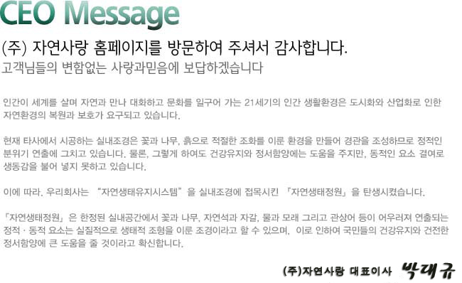 상호: (주)자연사랑 | 대표: 박대규 | 경기도 부천시 오정구 내동 16-6 | 사업자등록번호: 130-86-33617
