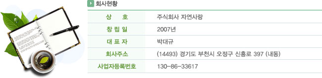 상호: (주)자연사랑 | 대표: 박대규 | 경기도 부천시 오정구 내동 16-6 | 사업자등록번호: 130-86-33617